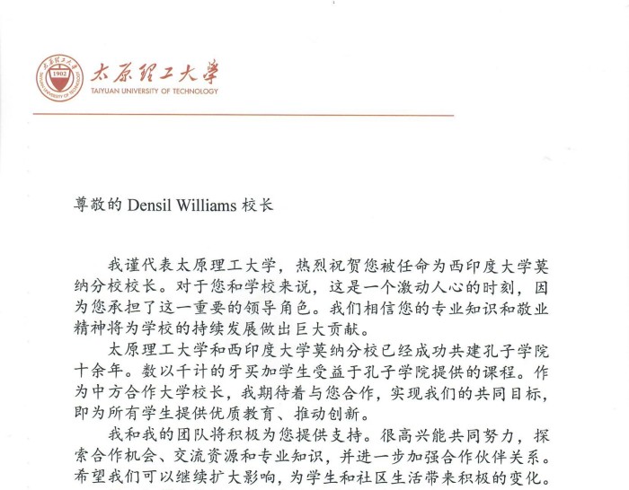 我校致信祝贺丹希尔·威廉姆斯任牙买加西印度大学莫纳分校校长