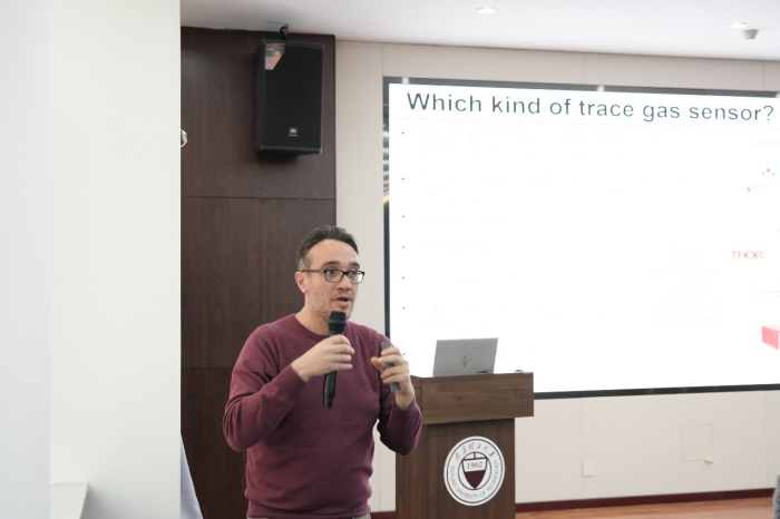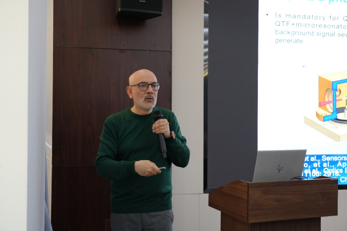 Vincenzo Spagnolo教授在题为《Quartz-enhanced photoacoustic Light-:Induced thermoelastic spectroscopic techniques for gas sensing applications》的报告中详细描述了基于定制石英音叉在OEPAS和LITES传感领域的成果,重点关注其实际应用,详细介绍了一种创新的鞋盒尺寸QEPAS传感器系统。