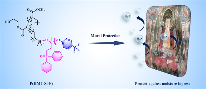 团队针对壁画因环境温湿度波动及盐结晶作用引发的加速劣化问题,基于多组分分子协同机理,将氟苯基团(疏水抗盐)、丙烯酸单元(界面粘附)、硅氧烷柔性链段(应力缓冲)与多重非共价键网络(氢键/π-π/F···F内聚强化)精准整合,研制出新型壁画保护材料P(HMT-Si-F)。该材料展现出多维度性能突破,实现1062~1092 μm深度渗透与92%的透光率,通过亲水-疏水复合结构在维持壁画91.3%孔隙率的同时,将吸湿率降至5.8%,攻克传统材料防潮性与透气性互斥的瓶颈;经480h冻融循环、盐蚀及648h紫外加速老化后,仍能保持壁画结构完整性,展现卓越的环境稳定性。论文通讯署名单位国产亚洲精品美女久久久_99久无码中文字幕一本久道_亚洲成AV人影院_亚洲AV影院一区二区三区 狠狠躁夜夜躁人人爽天天不卡_国产激情久久久久影院老熟女_精品性高朝久久久久久久化学与化工学院,张献明教授为通讯作者,2022级博士生吴小海为论文第一作者(DOI:10.1016/j.jobe.2025.112729)。