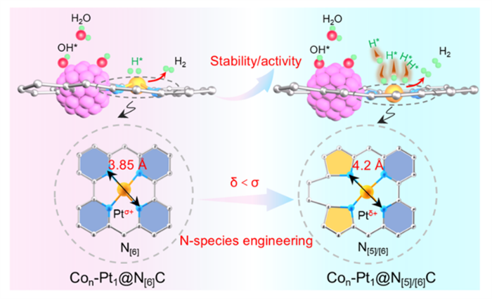 团队进一步提出通过调控吡咯N/吡啶N比例优化Pt原子本征电子结构以调节本征富H能力,优化原子局部酸性微环境的思路。在上述研究基础上,调控ZIF-8@ZIF-67的热解气氛,借助Co颗粒催化氢化反应,诱导碳环重构即吡啶N向吡咯N转变,实现吡咯N/吡啶N原子比约1/1(N[5]/N[6]=1/1)设计,并通过N配位限域锚定Pt原子研究表明催化剂槽电压仅为1.82 V@1 A cm-2并可稳定运行400 h@1 A cm-2。本部分通过调控Pt–N–C催化剂中吡咯N/吡啶N比例至1/1,实现了催化剂HER活性与稳定性的协同提升。论文通讯第一署名单位国产亚洲精品美女久久久_99久无码中文字幕一本久道_亚洲成AV人影院_亚洲AV影院一区二区三区 狠狠躁夜夜躁人人爽天天不卡_国产激情久久久久影院老熟女_精品性高朝久久久久久久材料科学与工程学院,王美玲副教授为通讯作者,2022级硕士生刘振宇为论文第一作者(DOI: 10.1039/d5ee01449b)。这些工作得到了国家自然科学基金面上项目、山西省科技创新人才青年团队项目以及中央引导地方发展基金等项目的支持。