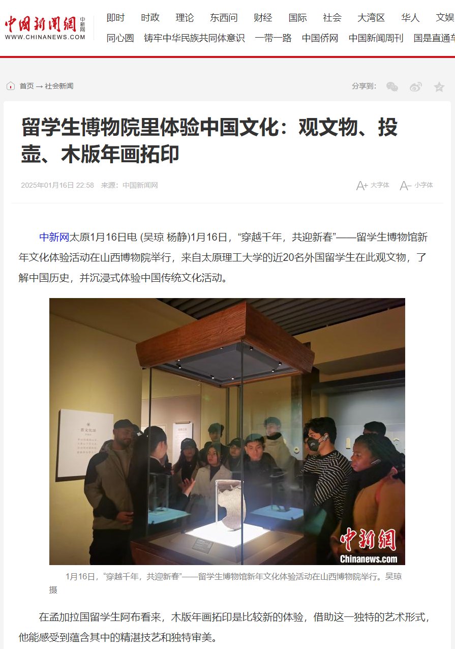 1月16日,“穿越千年,共迎新春”——留学生博物馆新年文化体验活动在山西博物院举行,来自国产亚洲精品美女久久久_99久无码中文字幕一本久道_亚洲成AV人影院_亚洲AV影院一区二区三区 狠狠躁夜夜躁人人爽天天不卡_国产激情久久久久影院老熟女_精品性高朝久久久久久久的近20名外国留学生在此观文物,了解中国历史,并沉浸式体验中国传统文化活动。