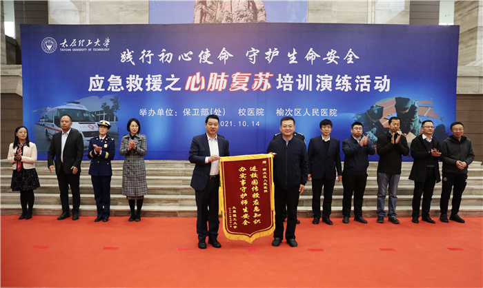 榆次区人民医院作为我校的驻地医疗机构,近年来为我们提供了及时高效的医疗保障服务,为表达我校师生对榆次区人民医院医护人员的敬意,活动中,吴斗庆代表学校向榆次区人民医院赠送题有“进校园传授应急知识办实事守护师生安全”的锦旗。
