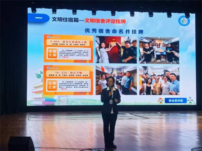 9月27日,在学校明向会堂,学院特别邀请公寓服务中心安全宣讲团的老师走进新生,开展了两场别开生面的公寓安全教育课,软件学院党委书记张文基,后勤保障部副部长贾新泽,软件学院党委副书记郭飞,后勤保障部公寓服务中心主任于爱菊也出席了本次宣讲活动。公寓宣讲团的老师从宿舍防火、防盗、食品安全、网络安全等多个维度出发,结合真实案例,深入浅出地讲解了公寓安全的重要性及防范措施。现场演示灭火器使用方法更是让新生们直观感受到了安全技能的实际操作,为他们在公寓内营造一个安全、和谐的生活环境提供了有力保障。