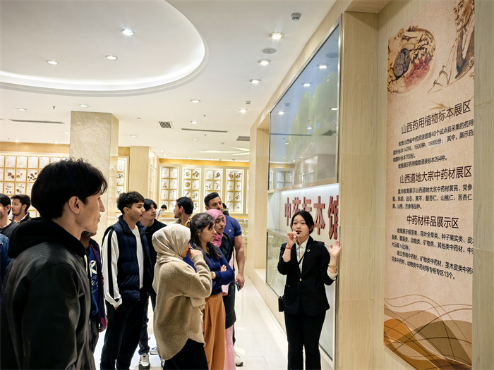 探秘中医药文化,对话千年智慧。4月10日,在山西中医药大学博物馆,国际学生亲身感受“望闻问切”的独特魅力,惊叹于传统医学对生命科学的深刻洞察。从《黄帝内经》古籍到针灸铜人模型,从地道药材标本到现代创新成果,通过直观的展品与生动的讲解,大家深入了解中医药的发展脉络、理论体系及诊疗智慧,学生们认真记录、频频提问。来自巴基斯坦的博士研究生雷海曼(REHMAN ZIA UR)被“药食同源”理念和“五禽戏”吸引:“原来枸杞和生姜既是食物也是药物,养生就在日常细节中,中国文化里的生活智慧太奇妙了!”。