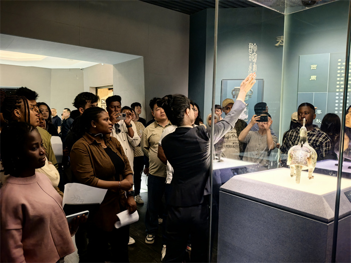 解码晋国青铜器:触摸汉字之源。4月17日,在山西博物院“变局—春秋时期的晋与秦”展厅,青铜器上的铭文成为特殊“中文课”。作为春秋时期晋国青铜礼器的晋公盘,成为全场焦点,同学们共同探寻晋公盘铭文所蕴含的历史密码,感受中文的博大精深。盘内壁镌刻着180多字的晋文公自述,笔画饱满、运笔灵活,向国际学生展现了早期汉字的书写美学。在讲解中,通过铭文拆解“晋”“宝”等古文字构型,同学们对照笔画猜测字义,学习古文字的构形原理与演变历程,古老文字跨越语言障碍,再次焕发出新的生机与活力。