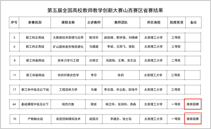 5月25日,由山西省教育厅主办的第五届高校教师教学创新大赛山西赛区比赛圆满落幕。我校选派的7名教师(团队)分别获一等奖2项、二等奖1项、三等奖4项,其中基础课程中级及以下组程岩、产教融合组赵国贞两个团队以省赛一等奖的优异成绩晋级国赛。
