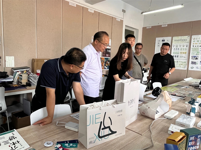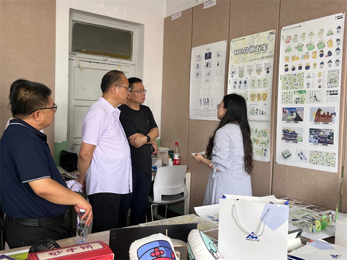 调研交流期间,宋林伟一行前往迎西校区思韵楼参观了学生设计的介休文创作品展览,工业设计系主任、课程指导教师和山西古建基地负责人进行了现场讲解。建筑学院针对介休市文旅集团和企业需求,设计了一系列集历史性、文化性、艺术性和实用性为特色的文创产品。宋林伟对学生作品的设计思路及教学设计成果给予了高度评价,并希望能将优秀作品尽早落地,投放市场。