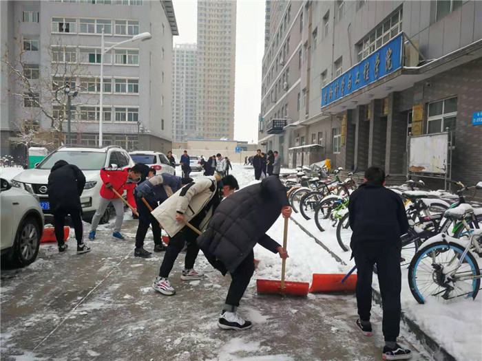 全体人员于中午十二点半准时在学院楼前集合,领取清扫工具,为保证快速高效地完成本次扫雪行动,针对学院楼门前及周边道路的积雪,现场人员分组、道路分段,各小组成员各司其职、团结协作,用铁锹、扫帚等工具对道路积雪和结冰进行清扫,寒冷的天气并未影响师生们的劳动热情,大家齐心协力,克服低温,在严寒中经过两个多小时的努力,圆满完成清扫任务。